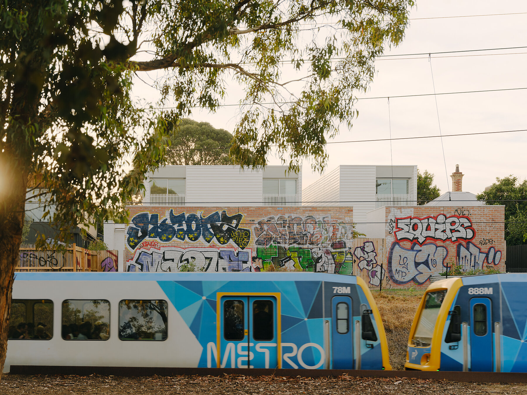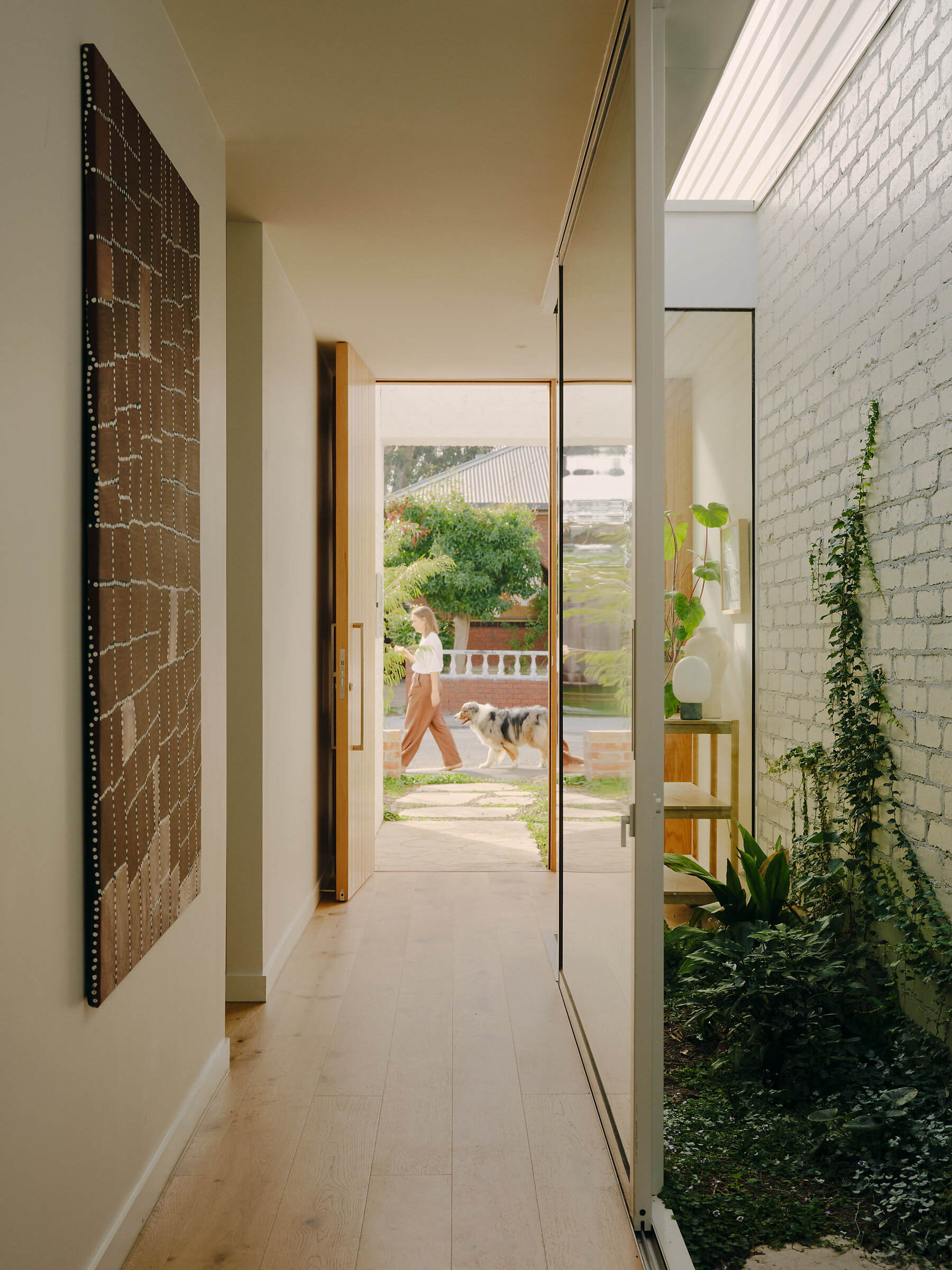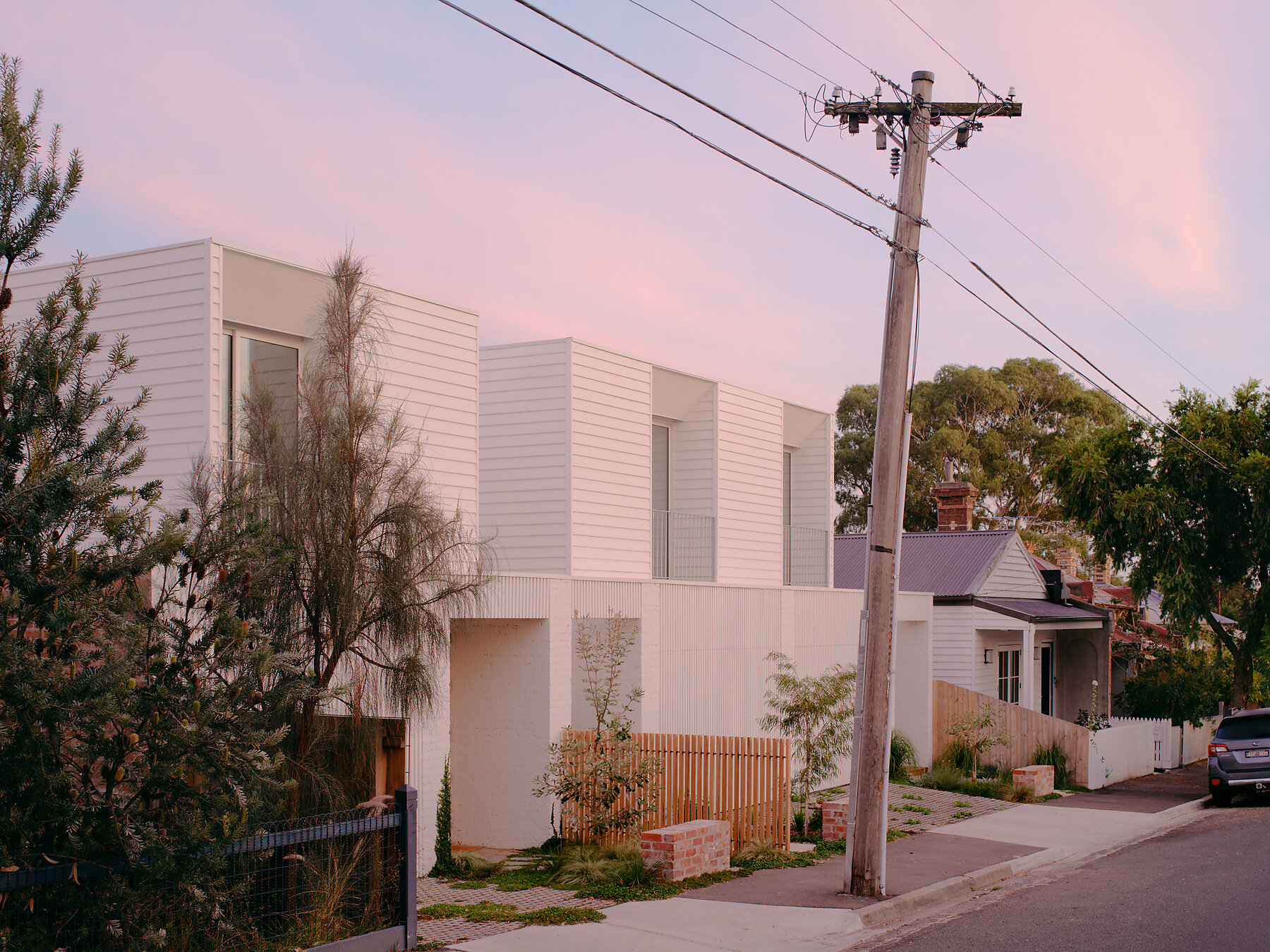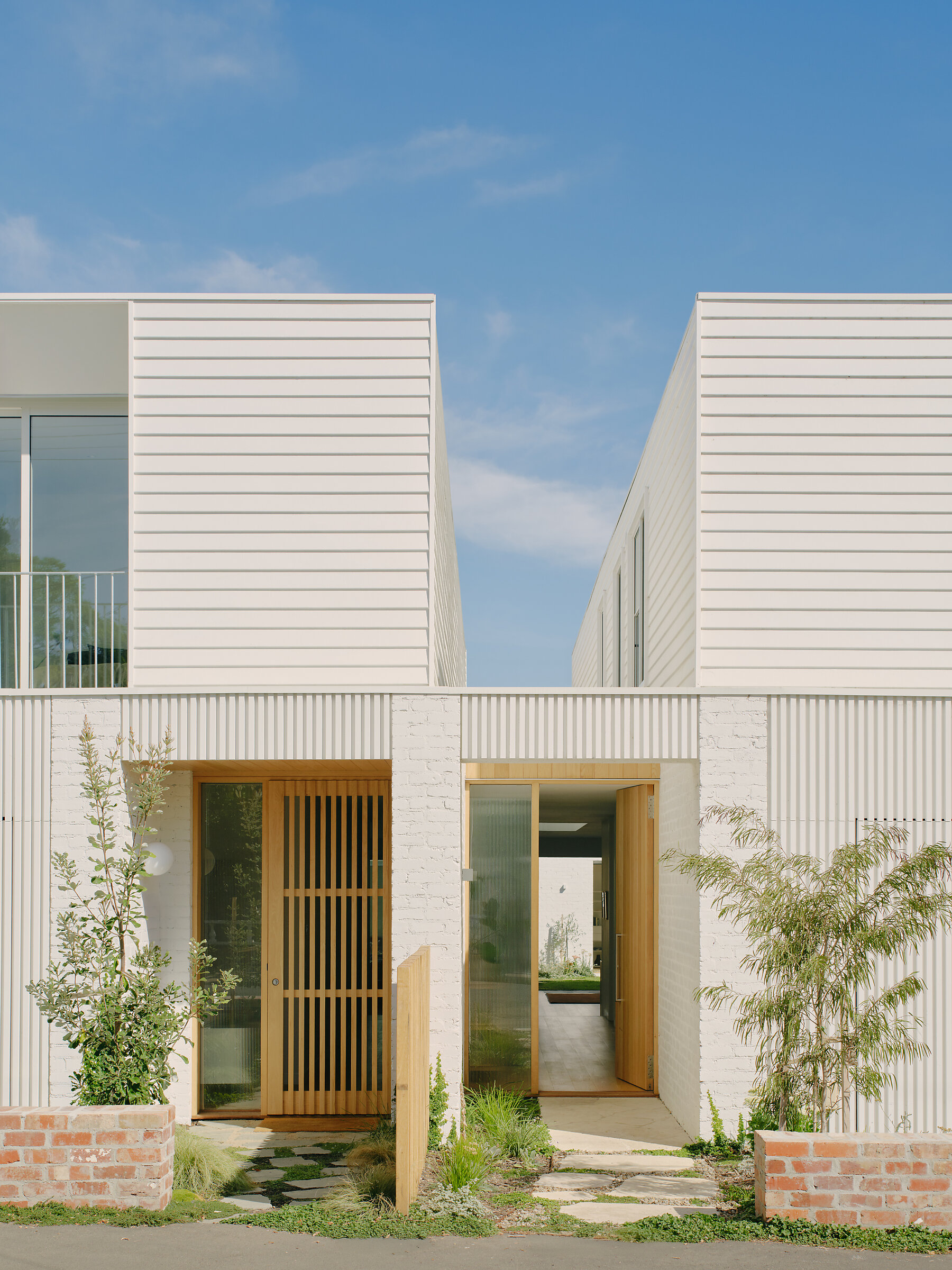 Set between Northcote’s bustling High Street and the Mernda train line, with a heritage-listed Greek Orthodox monastery and church beyond, the generous site originally hosted a single Italian brick veneer house surrounded by fruit trees. Recognising the opportunity to increase its density, the couples undertook a detailed feasibility study to explore how to best optimise the land. In doing so, they sought to challenge the typical townhouse model, often defined by a single shared driveway and a row of units running the length of the block. By making use of the site’s two existing crossovers—an inherent asset—the new design grants each townhouse its own driveway, garage and street frontage, creating autonomy and equal amenity across all three homes.