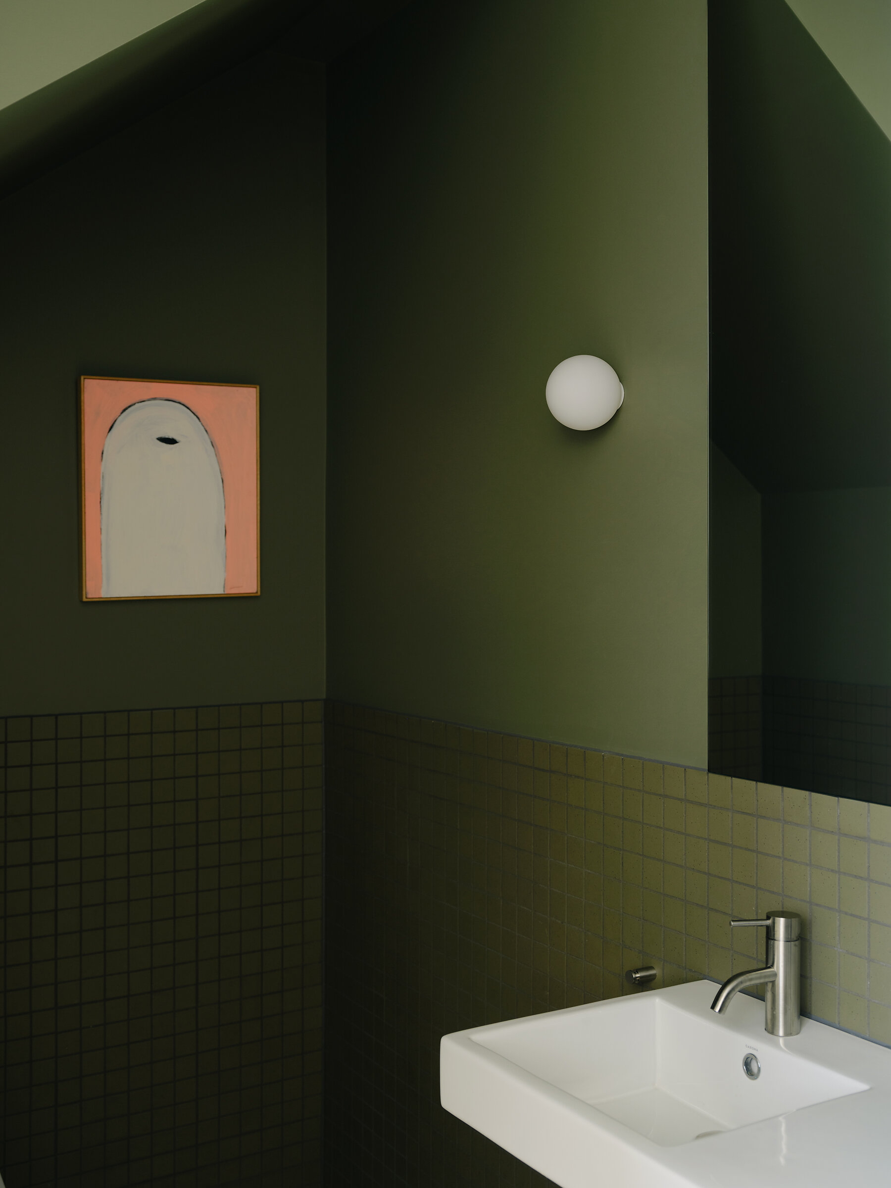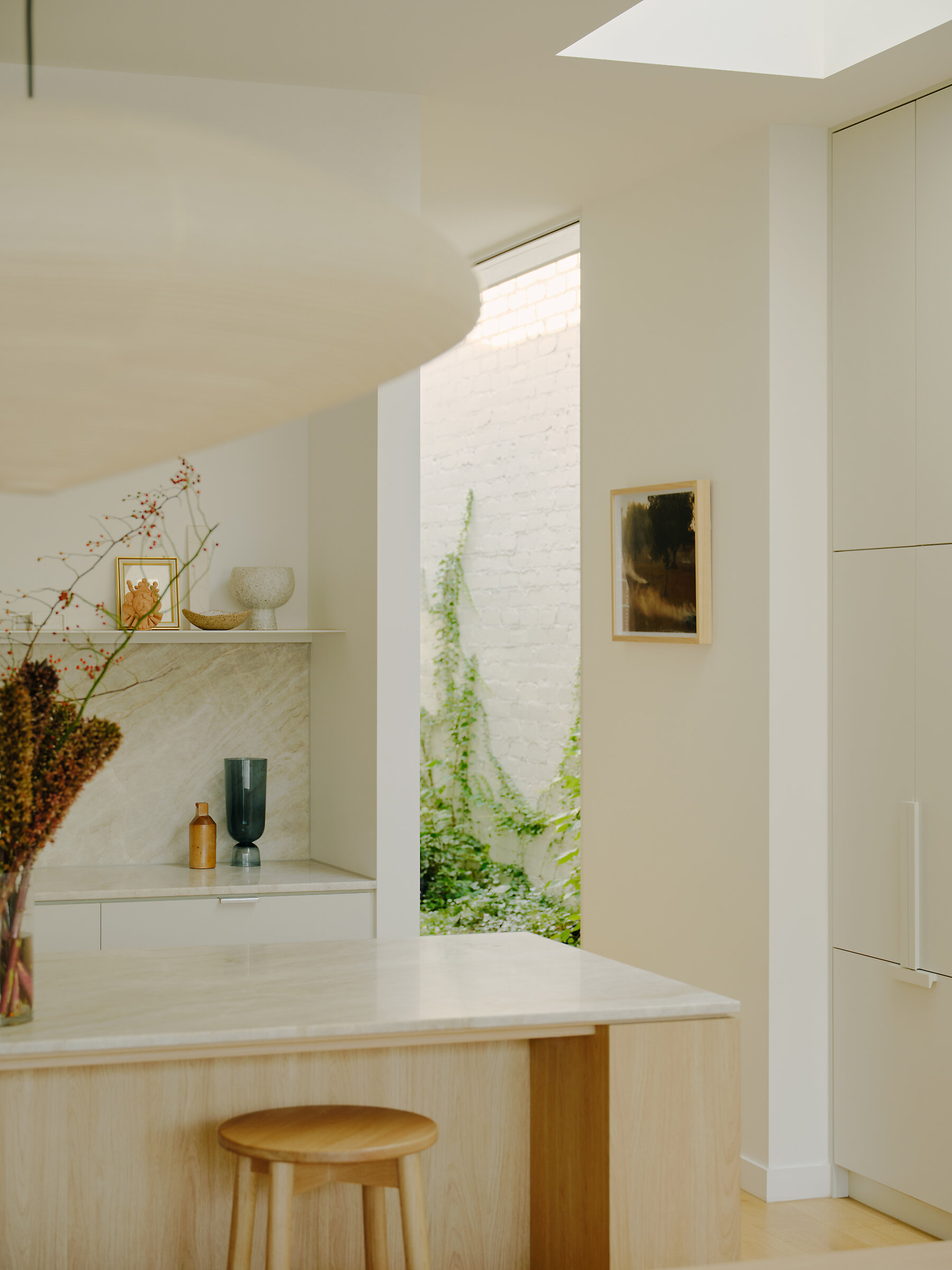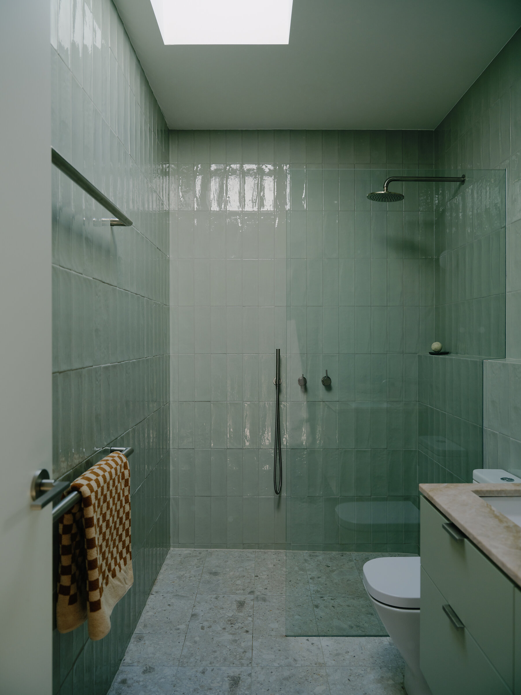 Materially, the project’s quiet sensibility prevails inside. Neutral cabinetry, pale walls and mellow timber floorboards create a calm, resilient base palette. Honed quartzite benchtops introduce a moment of luxury in the kitchen – the stone’s depth of visual texture grounds and elevates the palette. Hand-glazed ceramic tiles shroud each bathroom, with the powder room featuring a moody Eucalypt tone inspired by the local landscape.