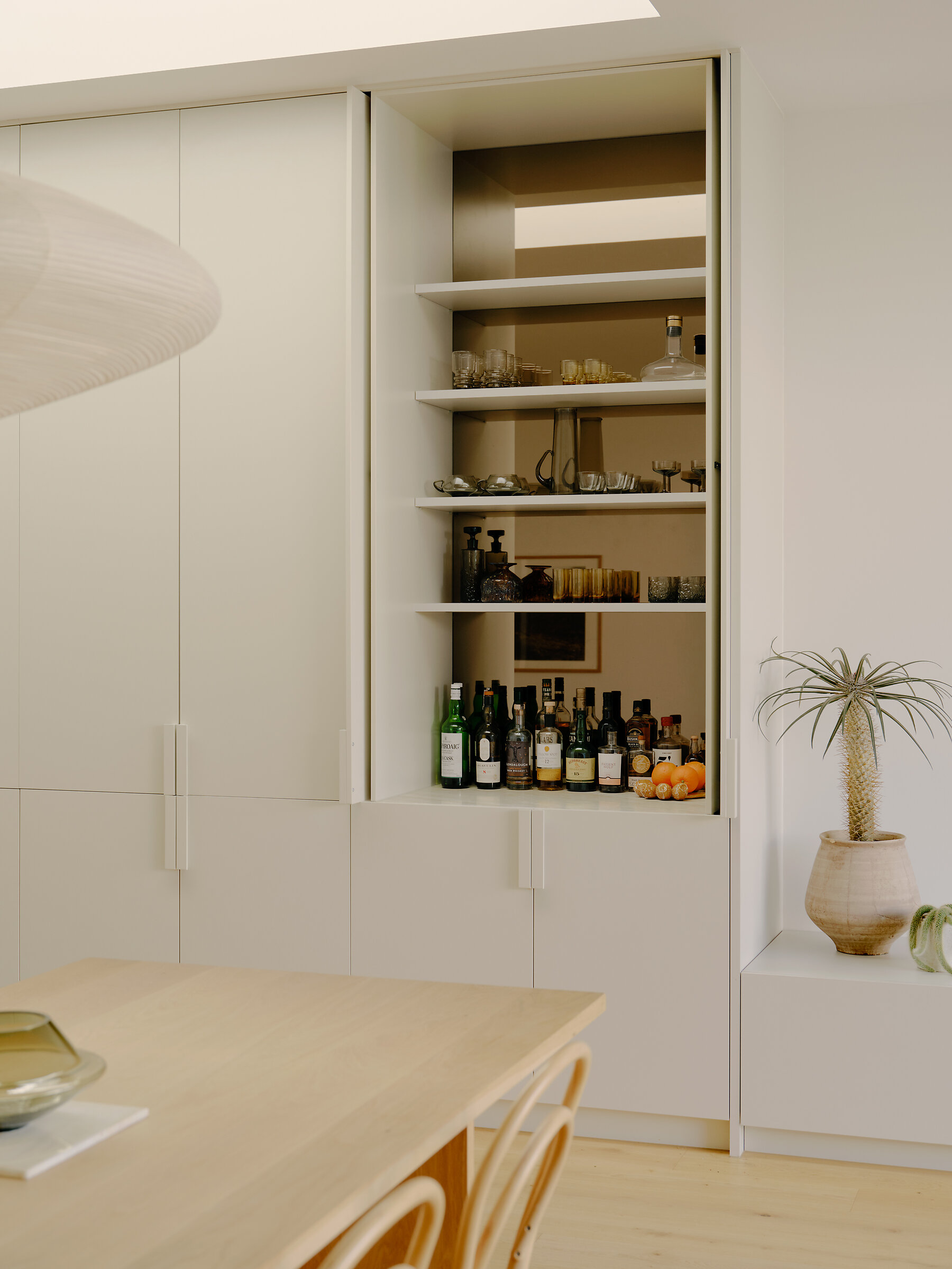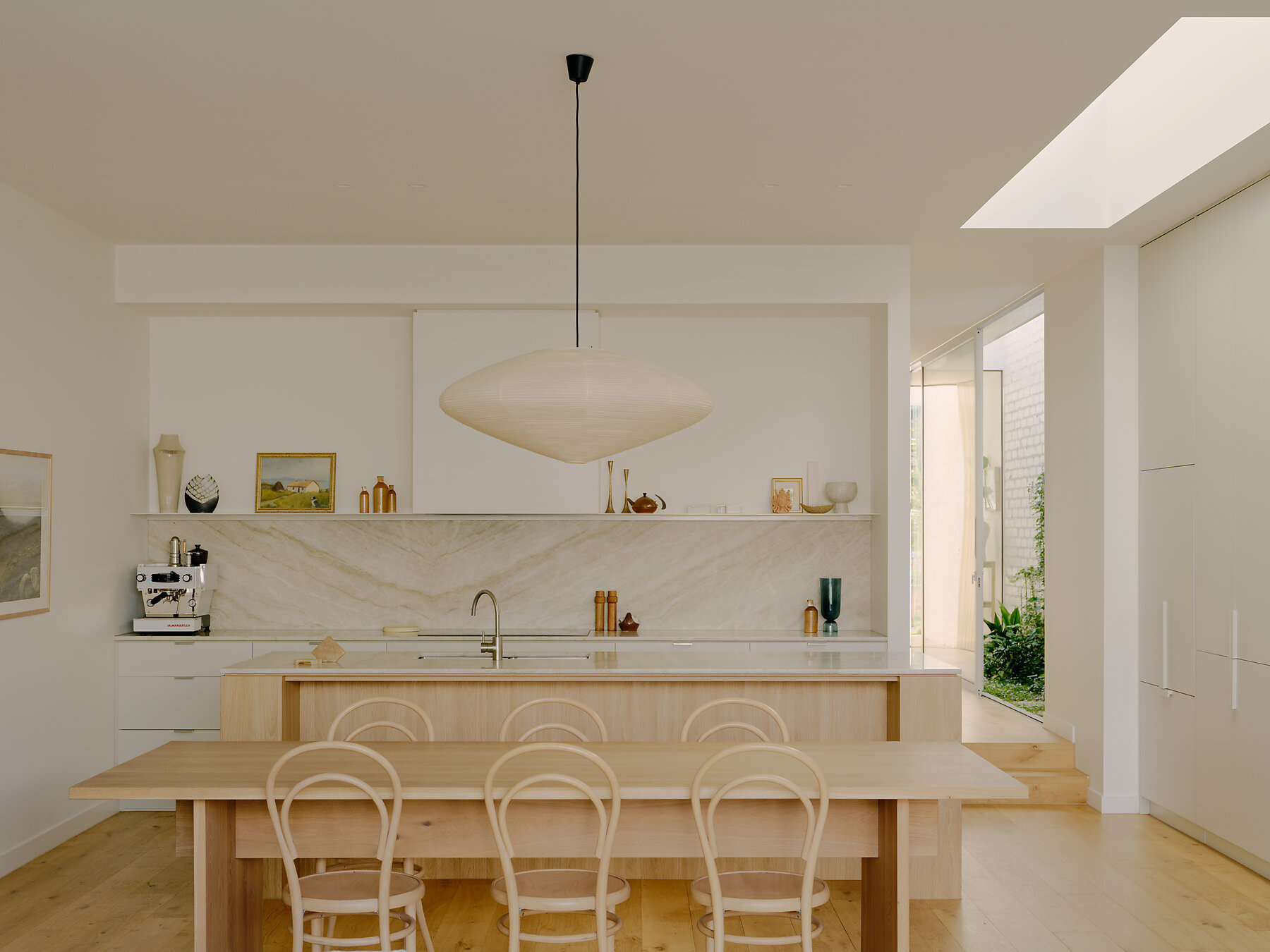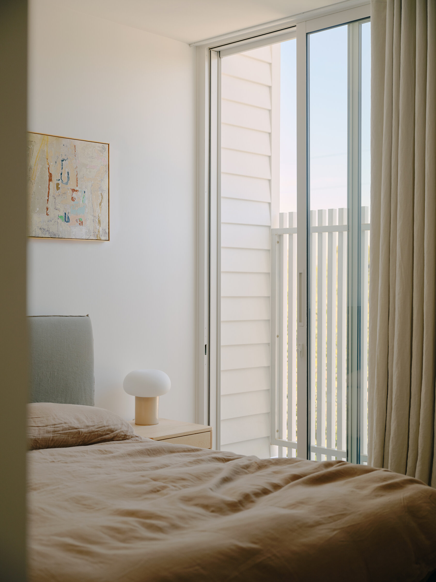 Materially, the project’s quiet sensibility prevails inside. Neutral cabinetry, pale walls and mellow timber floorboards create a calm, resilient base palette. Honed quartzite benchtops introduce a moment of luxury in the kitchen – the stone’s depth of visual texture grounds and elevates the palette. Hand-glazed ceramic tiles shroud each bathroom, with the powder room featuring a moody Eucalypt tone inspired by the local landscape.