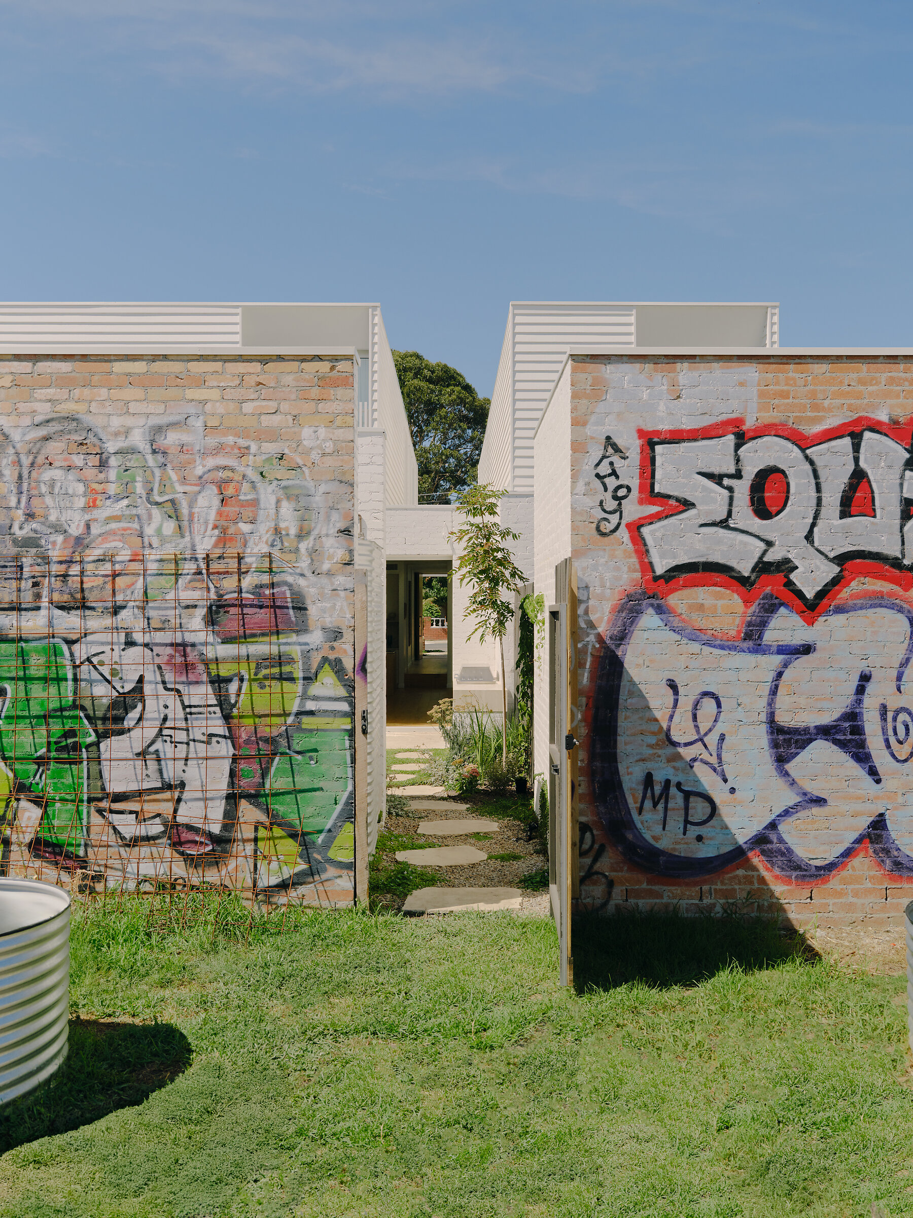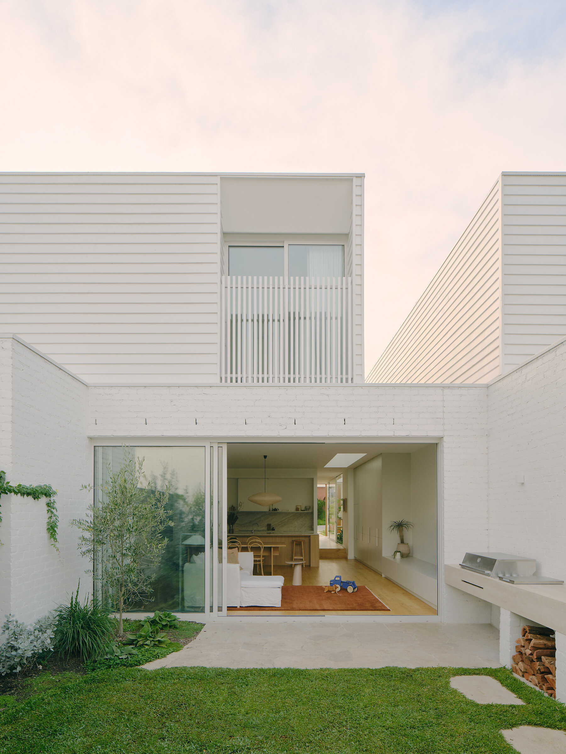 Behind the development’s modest frontage, each home contains three bedrooms, two bathrooms and a powder room, delivering excellent amenity for each family. An open kitchen, living and dining space expands dramatically to a rear garden, lawn and studio—a flexible zone to gather with family and friends. A shared community garden rests behind, offering a vibrant, ever-evolving environment for residents to connect, play, and unwind. The upper level captures unobstructed views across the suburb, treetops and monastery beyond—a private oasis to pause above the suburb’s hum.