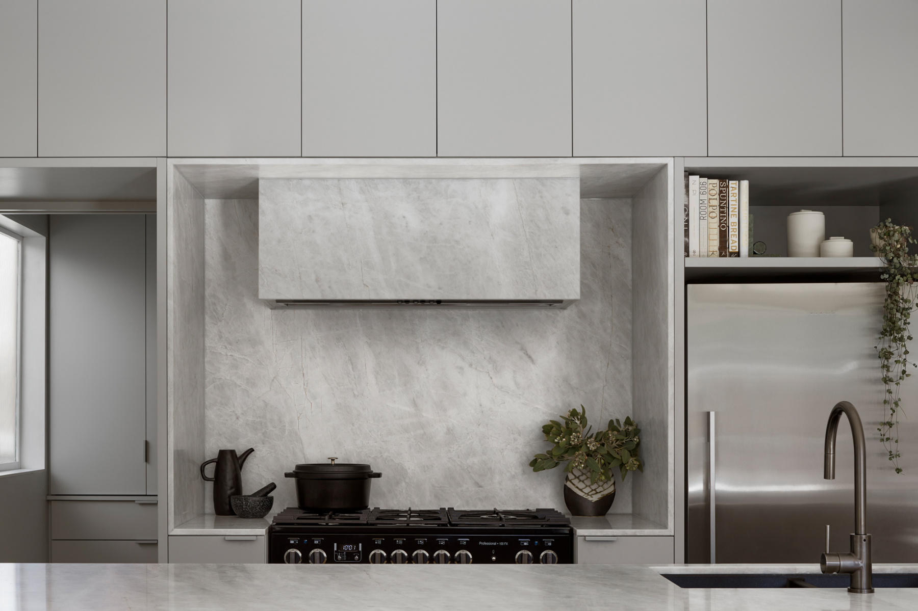 A palette of soft grey two-pack joinery finishes, Lima marble featuring intrinsic veins, warm timbers and dark bronze fixtures are sensitively balanced with refined sophistication, evident in the clean lines and light filled interior.